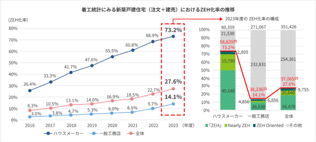 ZEHの普及率は、右肩上がりに伸びています。2023年度の新築戸建住宅を見ると、ZEH化率は27.6%に達しており、トップランナーを含むハウスメーカーがZEH化を牽引していることがわかります。