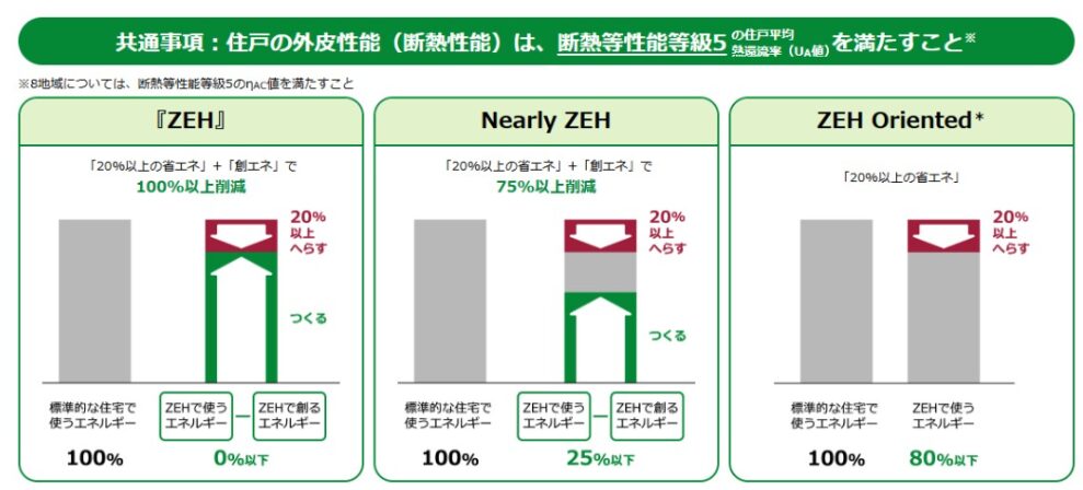 「Nearly ZEH」は寒冷地や低日射地域、『ZEH Oriented』は、多雪・低日射地域や都市部の狭小地などで、創エネ導入が難しい住宅を想定し、創エネ非必須の代わりに省エネでの削減率を満たすことで認定される区分です。