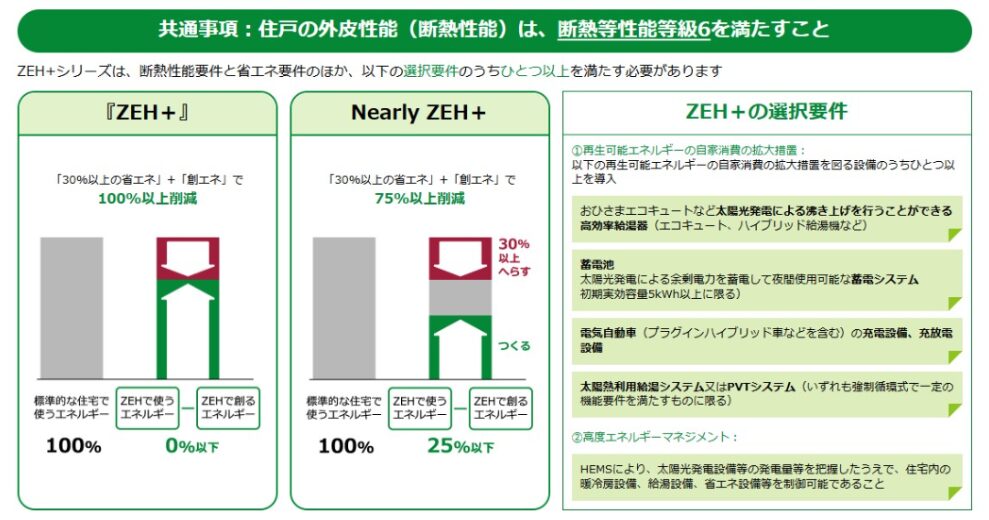 さらに断熱性能等級6以上と高度なエネルギーマネジメント導入を条件とする「ZEH+」も設けられています。
