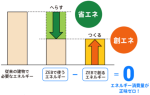 ZEBとは、「Net Zero Energy Building」の略称で、快適な室内環境を保ちながら、建築物で消費する年間の一次エネルギー消費量(冷暖房、換気、照明、給湯など)を、省エネによって大幅に削減し、再生可能エネルギーの導入により実質ゼロとすることを目指した建築物のことです。